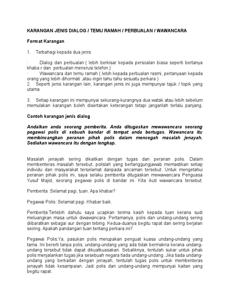 · dialog dan perbualan ( lebih . Karangan jenis dialog / temu ramah / perbualan / wawancara terbahagi kepada dua jenis. Karangan jenis ini merupakan karangan berformat.
